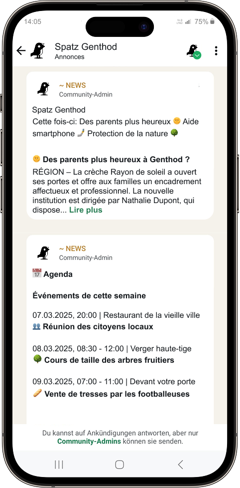 Reçois chaque jeudi les nouvelles de notre région : actualités, événements et échos de la vie locale. Spatz Genthod t’apporte tout ce qui compte chez nous : infos pour les familles, sport, économie, culture – et l’agenda de la semaine, du cours pour futures mamans aux fêtes de village, jusqu’aux sorties pour les seniors. Gratuitement, par WhatsApp et par e-mail.