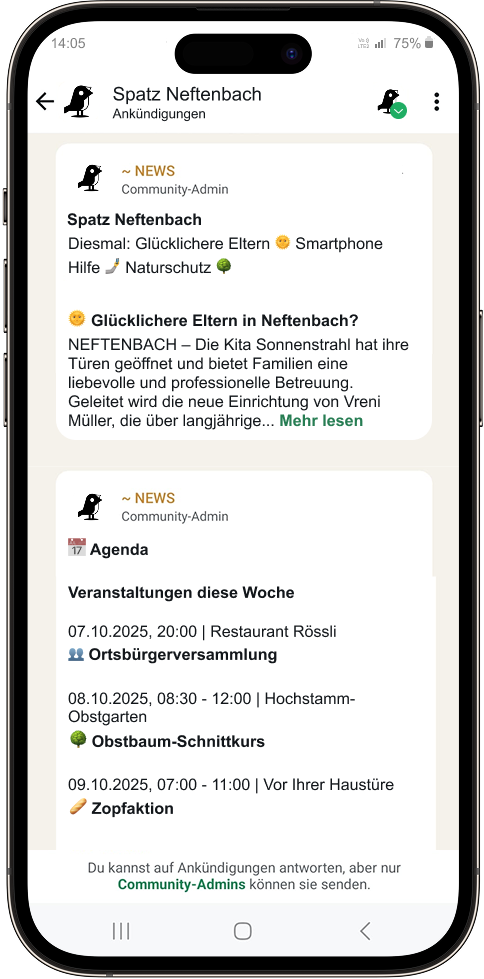 Wenn du Anliegen hast, melde dich: neftenbach@spatz.news