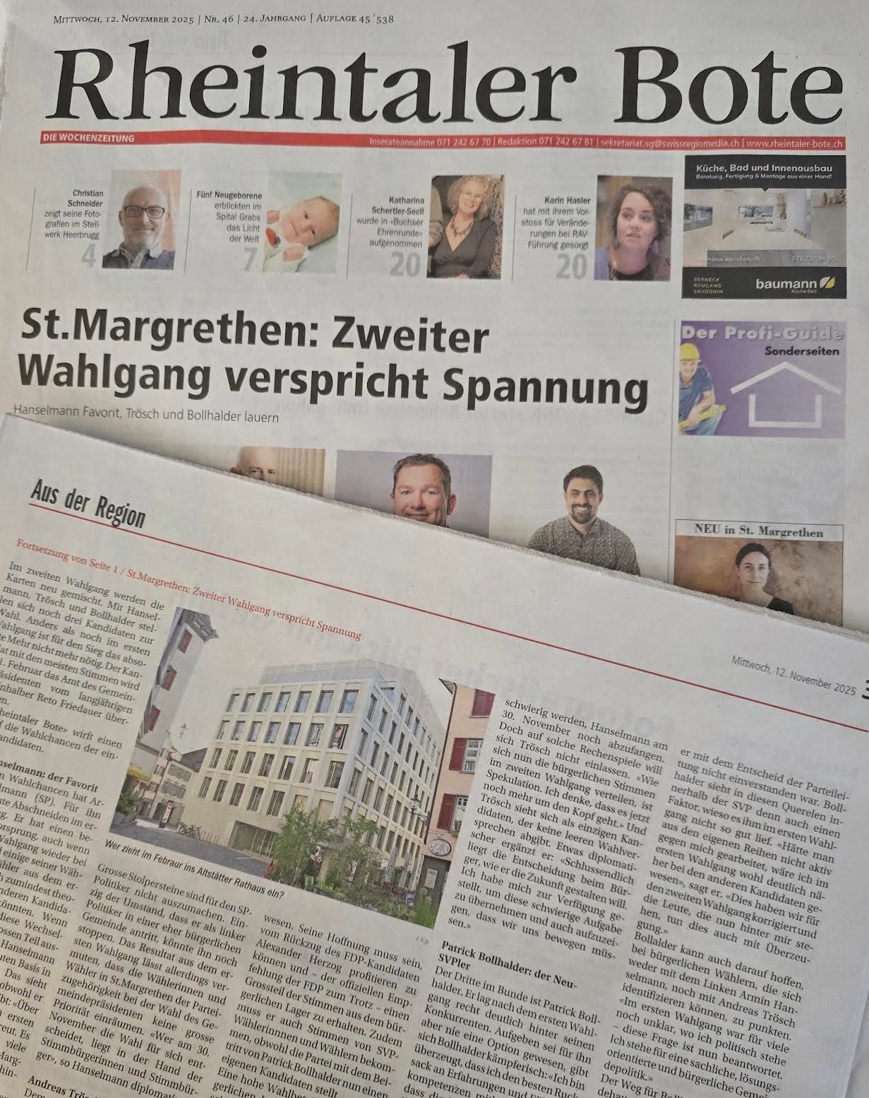 Das Gemeindehaus bleibt im Dorf  Bild einer «vielsagenden» Verwechslung. Foto: wim ST. MARGRETHEN – Ausgerechnet in der heissesten Phase des Wahlkampfes um das Amt des Gemeindepräsidenten von St. Margrethen unterläuft dem Rheintaler Boten eine kleine Verwechslung. Im Artikel über den zweiten Wahlgang suggeriert das Bild auf Seite 3 dass der Gemeinderat von St. Margrethen seine Wirkungsstätte neu nach Altstätten verlegt. Ich habe den Redaktor des Artikels, Gianni Amstutz kontaktiert. Er hat mir versichert, dass das Gemeindehaus von St. Margrethen im Dorf bleibt. Gianni Amstutz und ich sehen das Ganze mit einem Augenzwinkern und nehmen es mit Humor. (wim) Artikel weiterleiten